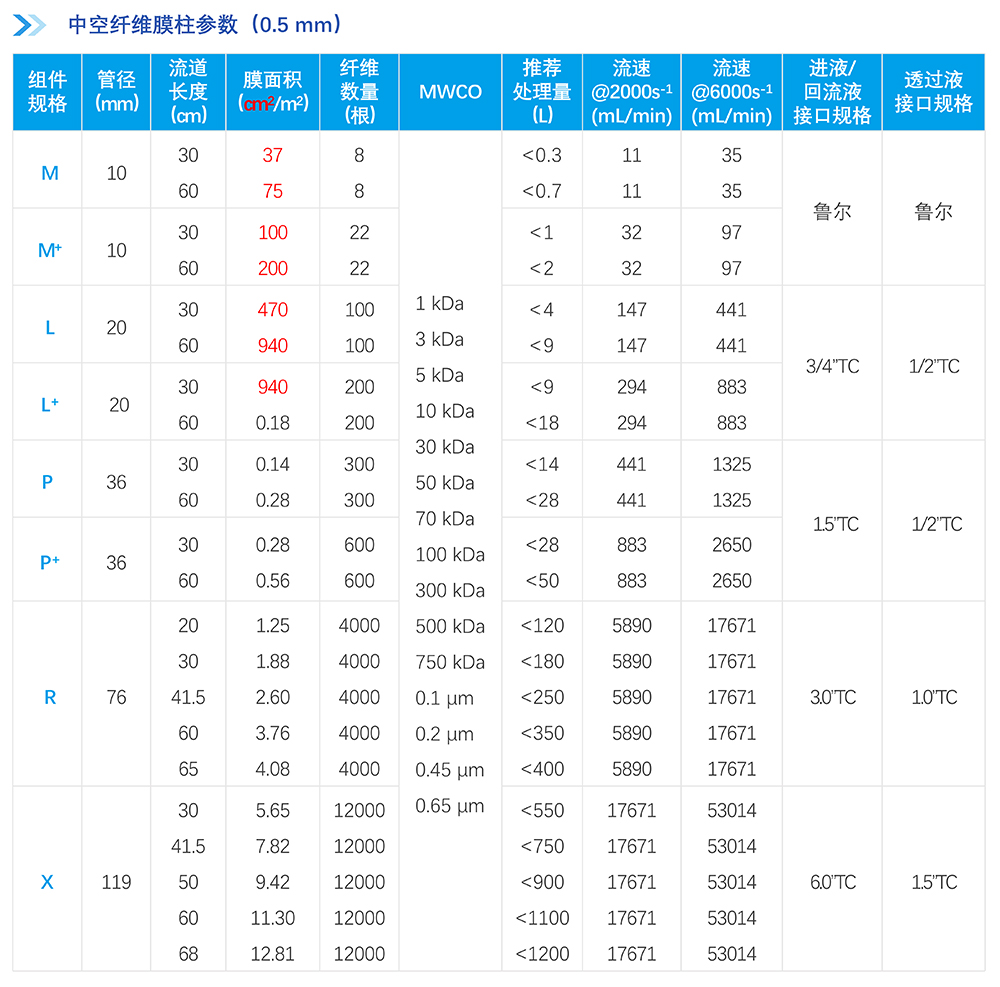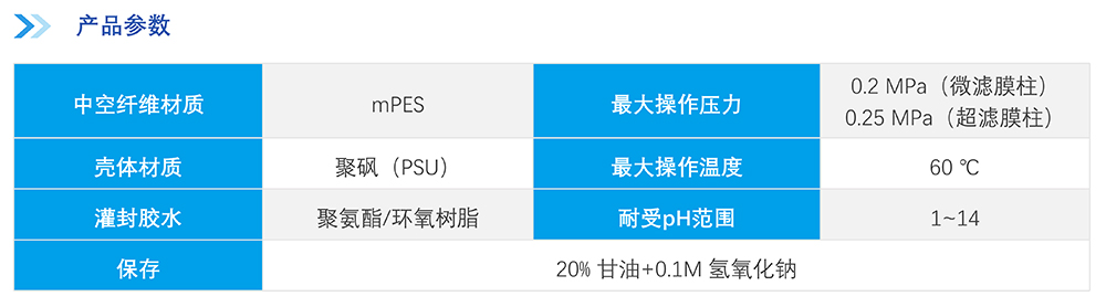 中空纖維膜絲采用改性聚醚砜(mPES)制備,抗污染性能強(qiáng);非對(duì)稱梯度孔結(jié)構(gòu)及均一孔徑保證高過濾精度的同時(shí)能獲取更高通量,提高產(chǎn)品收率。中空纖維膜柱采用符合醫(yī)療級(jí)別的外殼材料,生物相容性優(yōu)異,在滅菌環(huán)境中穩(wěn)定性優(yōu)良;選用的膠黏劑粘接強(qiáng)度高,耐熱性、耐化學(xué)性及生物相容性優(yōu)良;同時(shí)采用優(yōu)化的注膠工藝,注膠精度高,產(chǎn)品無缺陷。